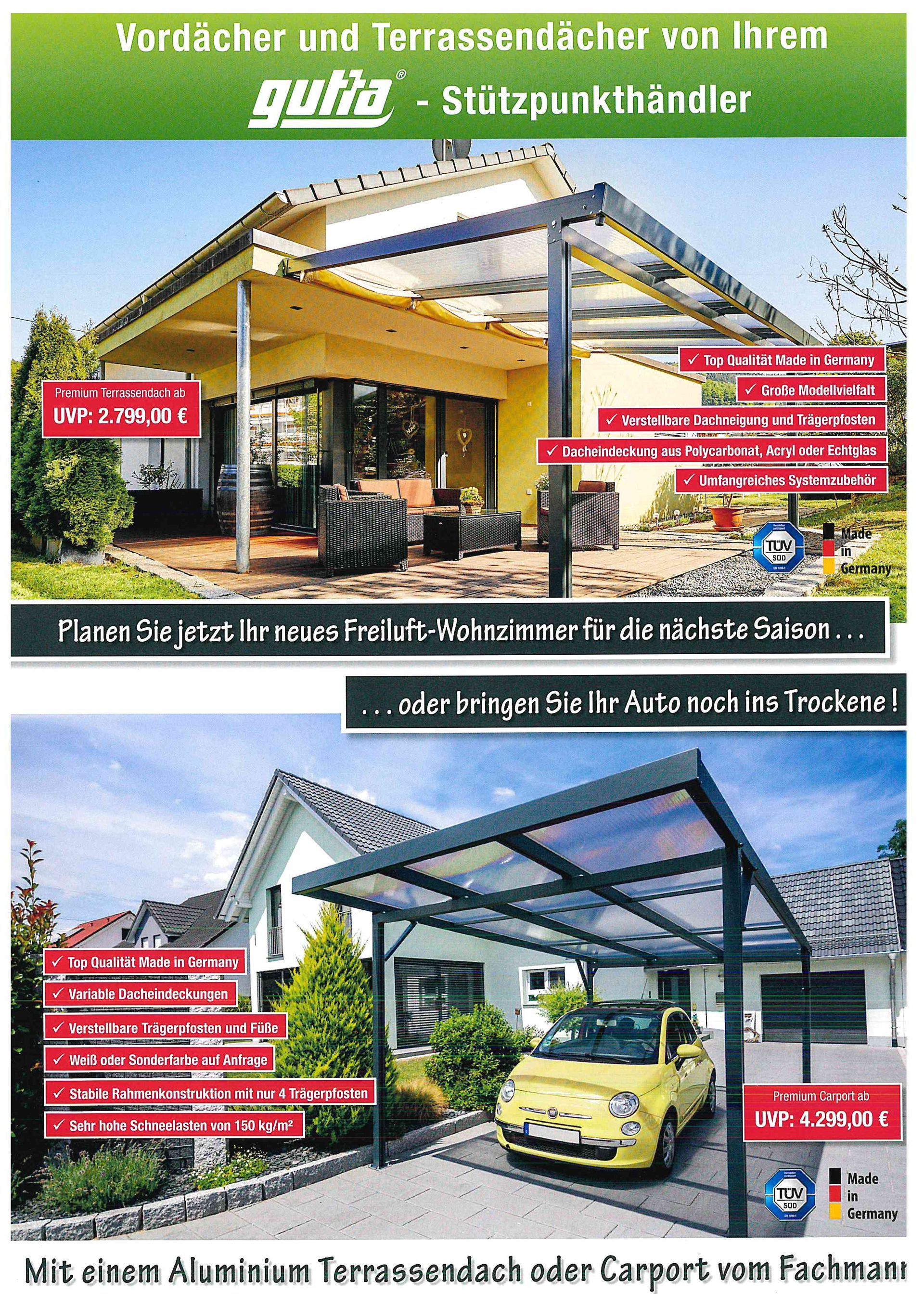 Sie können über uns als Stützpunkthändler Produkte von Gutta beziehen. Gerne stehen wir Ihnen zu Beratung, Aufmaß und Montage, der im folgenden Prospekt gezeigten Vordächer und Terrassendächer zur Verfügung.